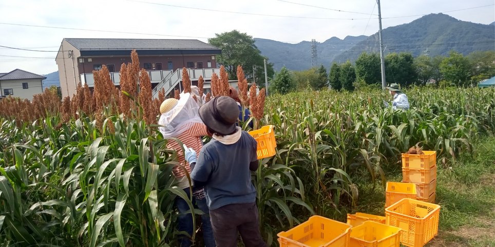 みらい望ファームで信州産ソルガム収穫をした休憩中の写真です。